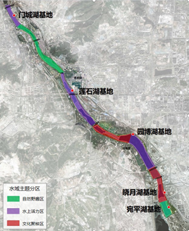 其中,门城湖设计亲水体验项目、培训及赛事,莲石湖设计了桨板、皮划艇等高端时尚亲水体验项目,园博湖设计赛艇、帆船、动力冲浪板等专业性水上运动,晓月湖设计专业水上活动培训、主题水上演艺,宛平湖则是设计轻量化户外露营基地、滨水摄影点、自然爱鸟科普讲堂等。