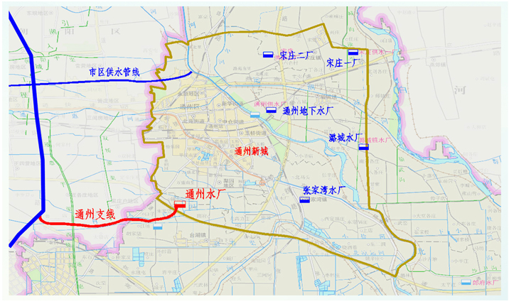 通州支线工程地处北京市东南部地区,起点位于朝阳区东五环路化工桥的东北角东干渠通州水厂分水口,终点为通州区的规划通州水厂,全长约 9km 。建设内容主要包括引水管线、调节池和提升泵站。